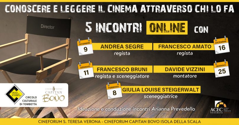 Due Sale della Comunità venete, la sala Capitan Bovo di Isola della Scala e la sala Santa Teresa di Verona, sono i promotori dell’iniziativa “Conoscere e leggere il cinema attraverso chi lo fa”, ciclo di cinque incontri online con professionisti di primo piano del mondo cinematografico (i registi Francesco Amato e Andrea Segre, il regista e sceneggiatore Francesco Bruni, la sceneggiatrice Giulia Luoise Steigerwalt, il montatore Davide Vizzini) per scoprire le dinamiche del “back stage” di ogni film, tra aneddoti e curiosità, raccontate dalla viva voce dei protagonisti.