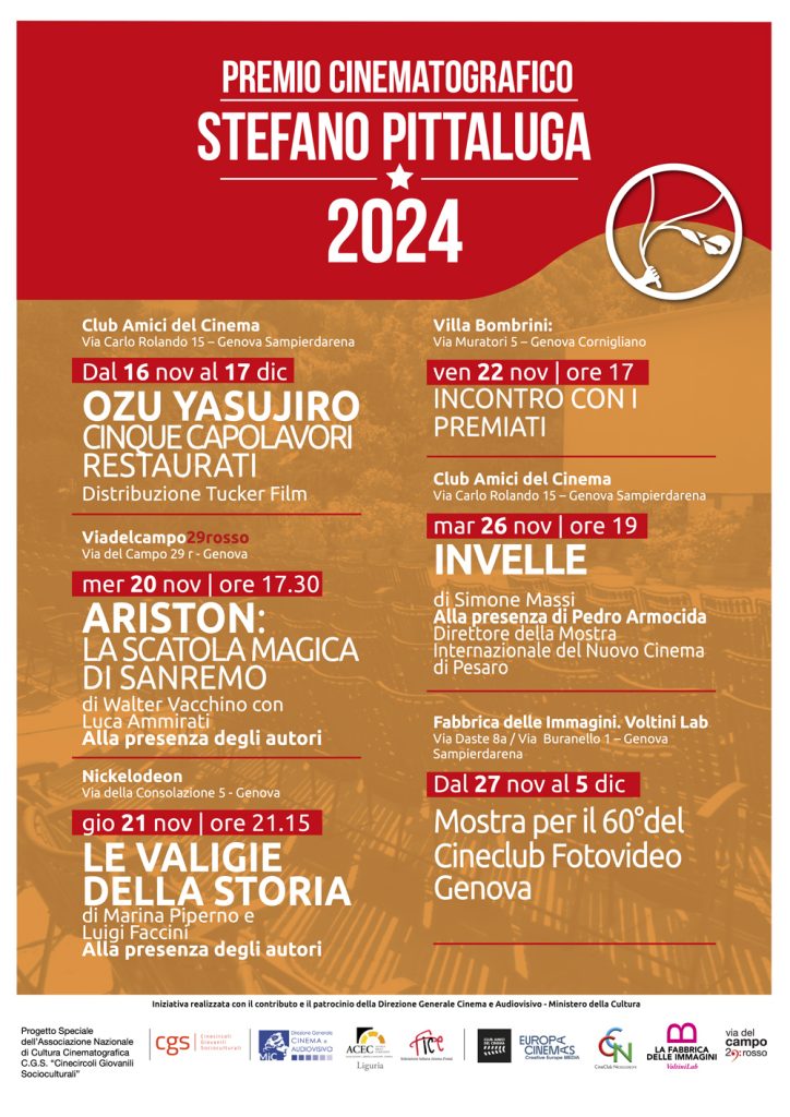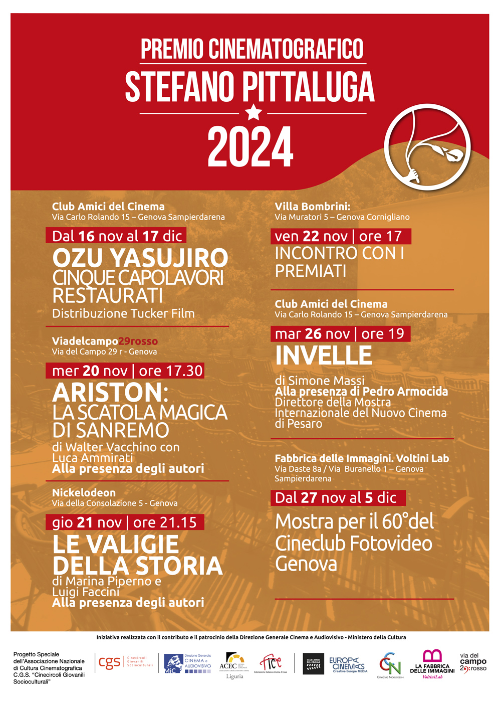 Venerdì 22 novembre, ore 17, nella prestigiosa sede di Villa Durazzo Bombrini (via Muratori, 5, Genova Cornigliano) si svolgerà la premiazione di Marina Piperno, Walter Vacchino, Tucker Film e Cineclub Foto Video Genova, mentre martedì 26 novembre alle 19 al Club Amici del Cinema (via Carlo Rolando, 15) il riconoscimento sarà consegnato a Pedro Armocida. Seguirà la proiezione di Invelle di Simone Massi, film d’animazione d’autore scelto dal vincitore.