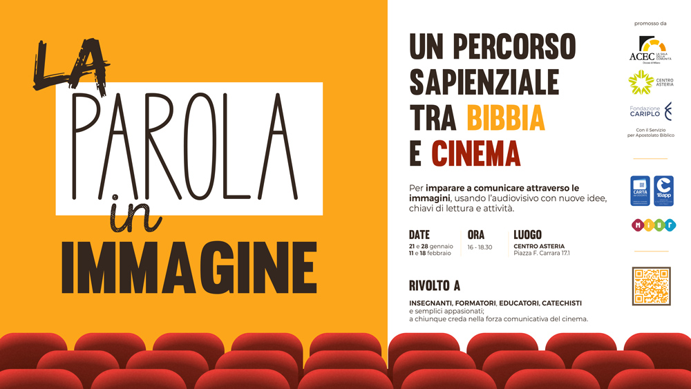 “La Parola in immagine” si svolgerà in presenza presso il Centro Asteria di Milano (piazza F. Carrara 17) per un totale di quattro appuntamenti dalle ore 16.00 alle 18.30. Il corso si rivolge in particolare a insegnanti, formatori, educatori, catechisti, ma anche a semplici appassionati sia di cinema che studiosi di Bibbia.