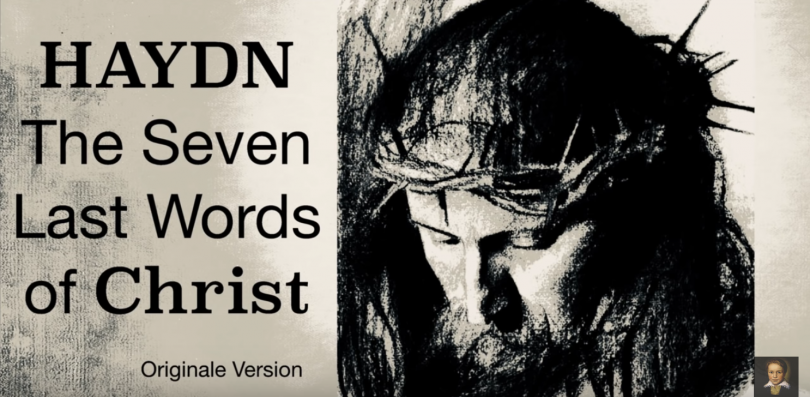Le sette sonate (che insieme all’introduzione e al “terremoto” finale compongono l’opera) sono pensate per fare da contrappunto musicale alla lettura e al commento delle Sette Parole di Cristo sulla Croce del testo evangelico, di cui mettiamo qui ad esempio il testo del teologo Raimon Panikkar.